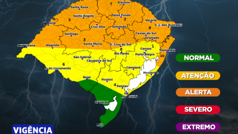 Acumulados variam entre 10 mm e 30 mm por dia, podendo chegar isoladamente aos 60 mm no Oeste, Missões e parte do Centro