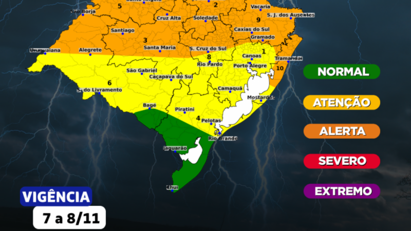 Acumulados variam entre 10 mm e 30 mm por dia, podendo chegar isoladamente aos 60 mm no Oeste, Missões e parte do Centro