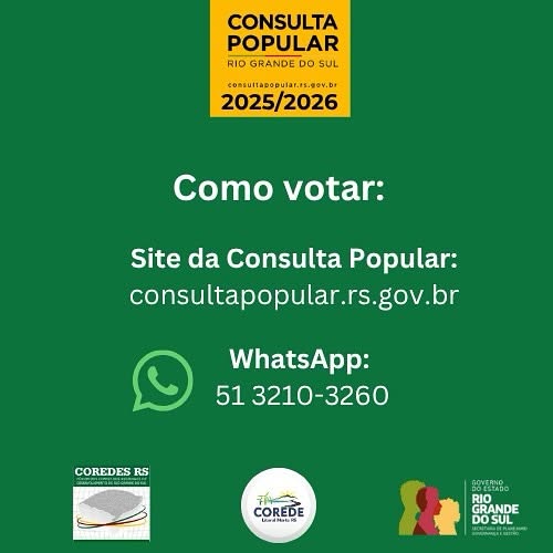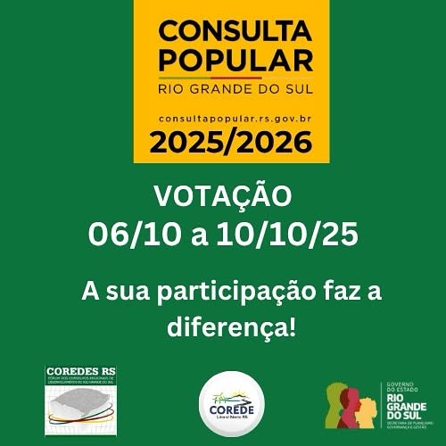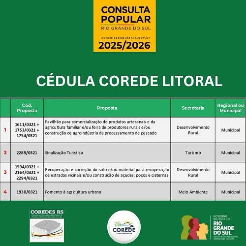 A Consulta Popular do Rio Grande do Sul está aberta de 06 a 10 de outubro, e todos podem participar votando nas propostas que mais beneficiam o nosso município e o COREDE Litoral.