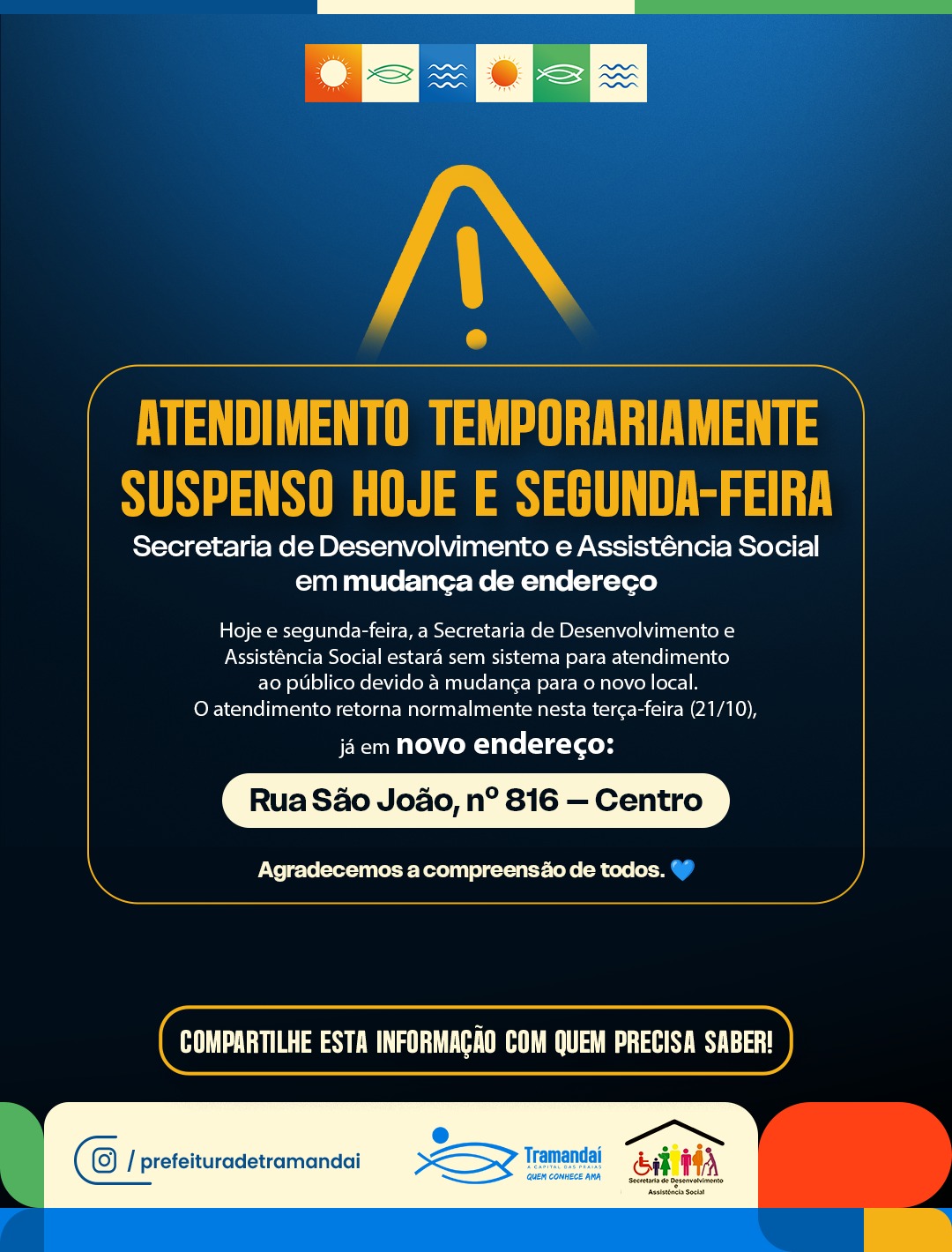 A Prefeitura de Tramandaí, por meio da Secretaria de Desenvolvimento e Assistência Social, informa que o atendimento ao público estará temporariamente suspenso na sexta-feira (17) e segunda-feira (20) devido à mudança de sede da Secretaria.