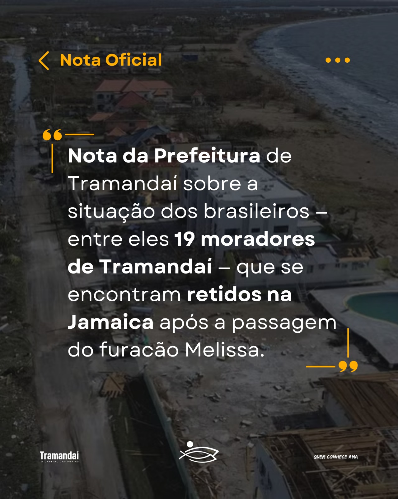 A Prefeitura de Tramandaí informa que está acompanhando com grande preocupação a situação dos brasileiros — entre eles 19 moradores de Tramandaí — que se encontram retidos na Jamaica após a passagem do furacão Melissa, que atingiu o país na última terça-feira (28) com ventos de até 298 km/h, sendo classificado como categoria 5, a mais alta na escala de intensidade.