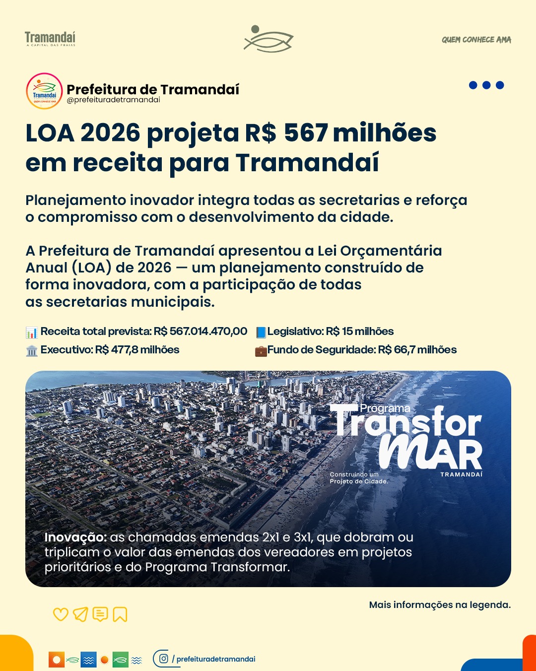 Está tramitando na Câmara de Vereadores o projeto da Lei Orçamentária Anual 2026 de Tramandaí (Projeto de Lei 145/2025). Confeccionada de forma inovadora, sua elaboração integrou todas as secretarias municipais e projeta receitas de R$ 567.014.470,00 para 2026.
