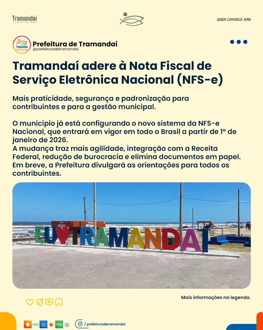 O município de Tramandaí já fez a adesão ao convênio da Nota Fiscal de Serviço eletrônica (NFS-e Nacional). A NFS-e Nacional representa um importante passo para a padronização e a integração da emissão de notas de serviço, trazendo mais praticidade para os contribuintes, mais segurança nas informações e mais eficiência para as administrações municipais.