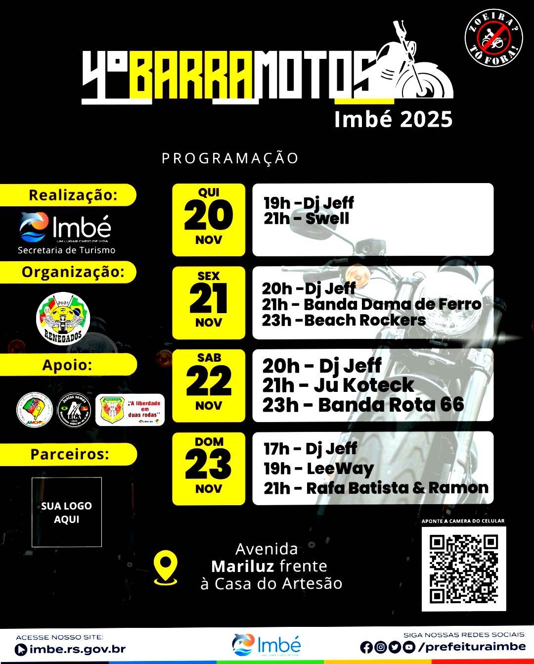 A 4ª edição do Barra Motos, evento focado no público amante do universo das duas rodas acontece de 20 a 23 de novembro na Avenida Mariluz, em frente a Casa do Artesão, no balneário Mariluz, devido as obras de duplicação da Avenida Nilza Costa Godoy.