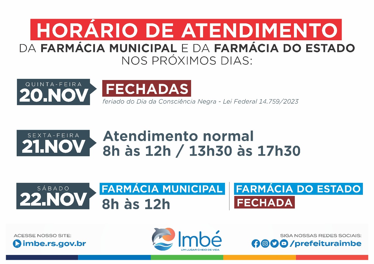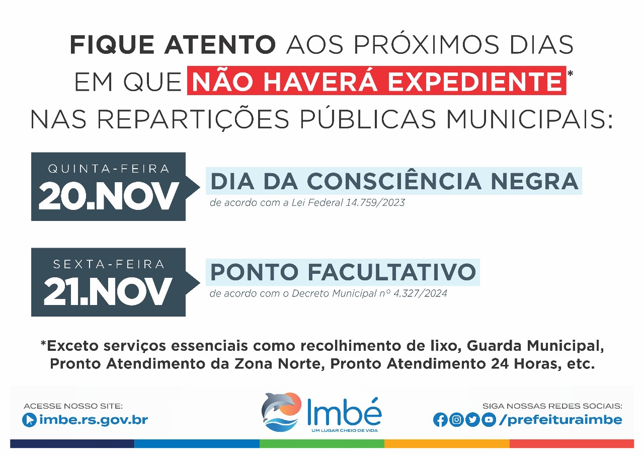 A Prefeitura de Imbé comunica que fará ponto facultativo nos serviços administrativos na próxima sexta-feira (21), em razão do feriado do Dia da Consciência Negra, que ocorre nesta quinta-feira (20). Nesta data, as repartições públicas não terão atendimento.