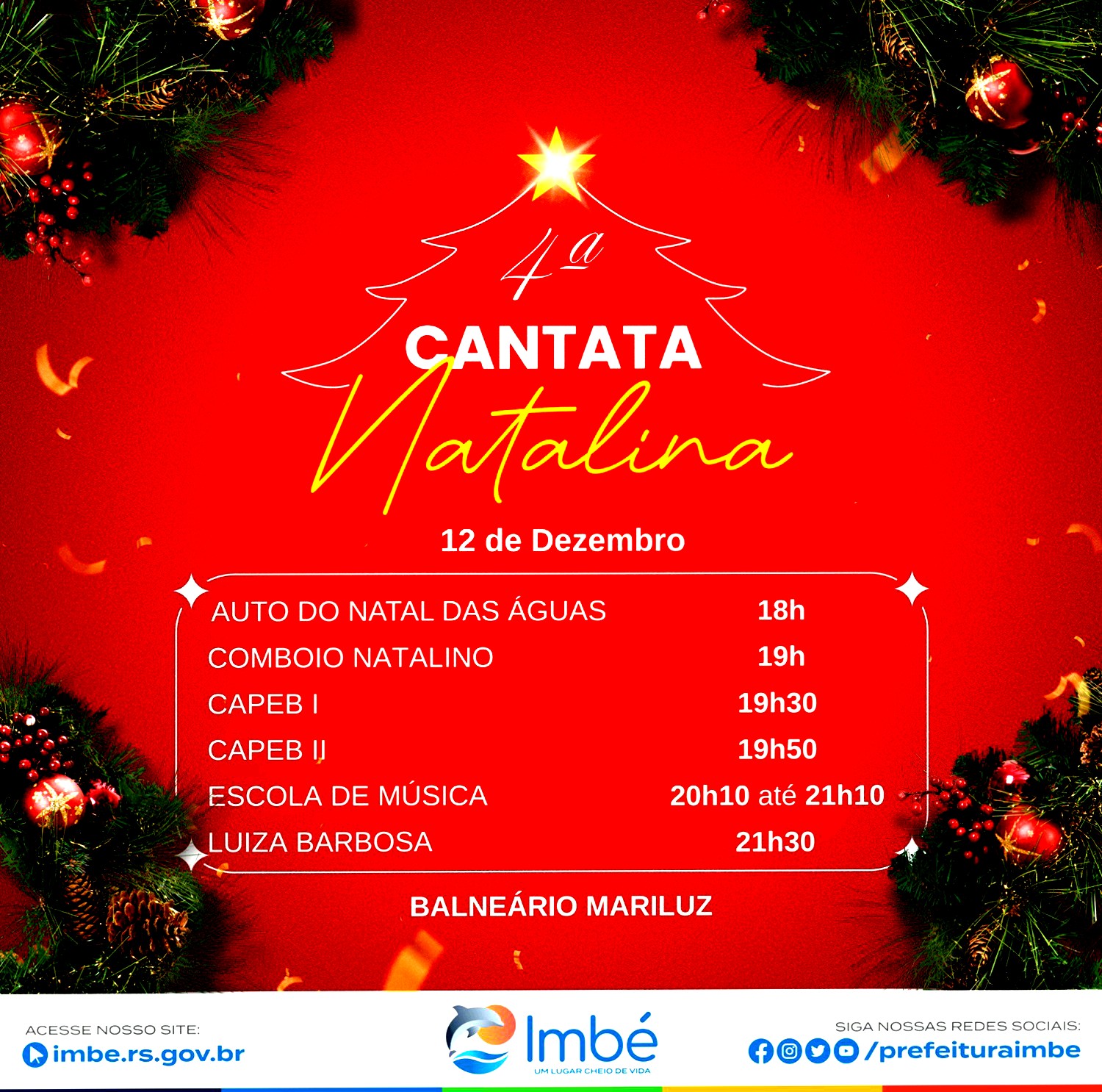 A Prefeitura de Imbé, por meio das secretarias municipais de Educação (SMED) e de Turismo (SETUR), realizará na próxima sexta-feira (12) a quarta edição da Cantata Natalina, na Avenida Mariluz, no balneário Mariluz, a partir das 18h. O evento será aberto ao público.