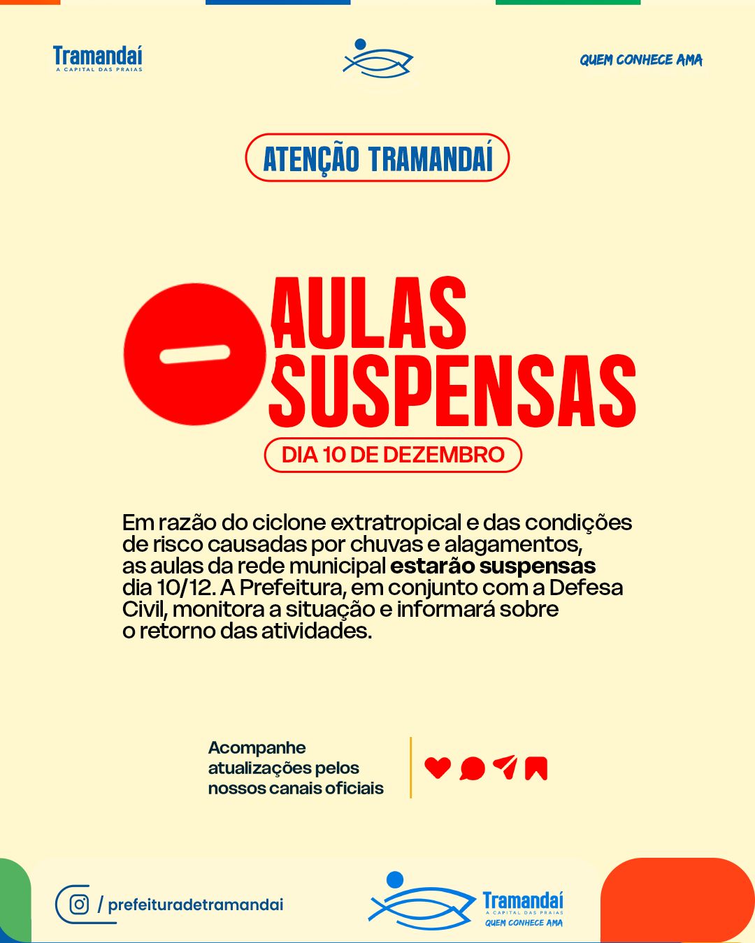A Prefeitura de Tramandaí informa que todas as aulas da rede municipal de ensino estão suspensas nesta quarta-feira, dia 10, devido aos eventos climáticos que estão atingindo nossa cidade.