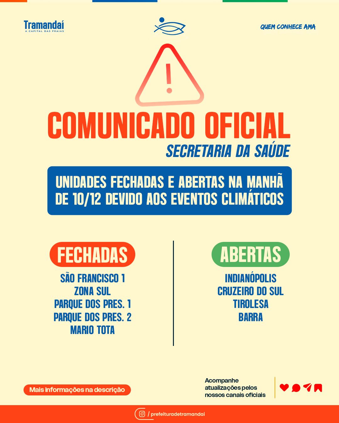 A Prefeitura de Tramandaí, por meio da Secretaria Municipal da Saúde, informa que, devido ao alerta da Defesa Civil e às condições climáticas adversas, algumas unidades de saúde não funcionarão no turno da manhã desta quarta-feira (10/12).