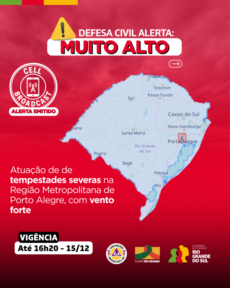 Defesa Civil alerta SEVERO/CELL BROADCAST para atuação de tempestades severas na Região Metropolitana de Porto Alegre, com vento forte. Válido até 16h20 de 15 de dezembro. Mantenha-se seguro. Emergência ligue 190/193.