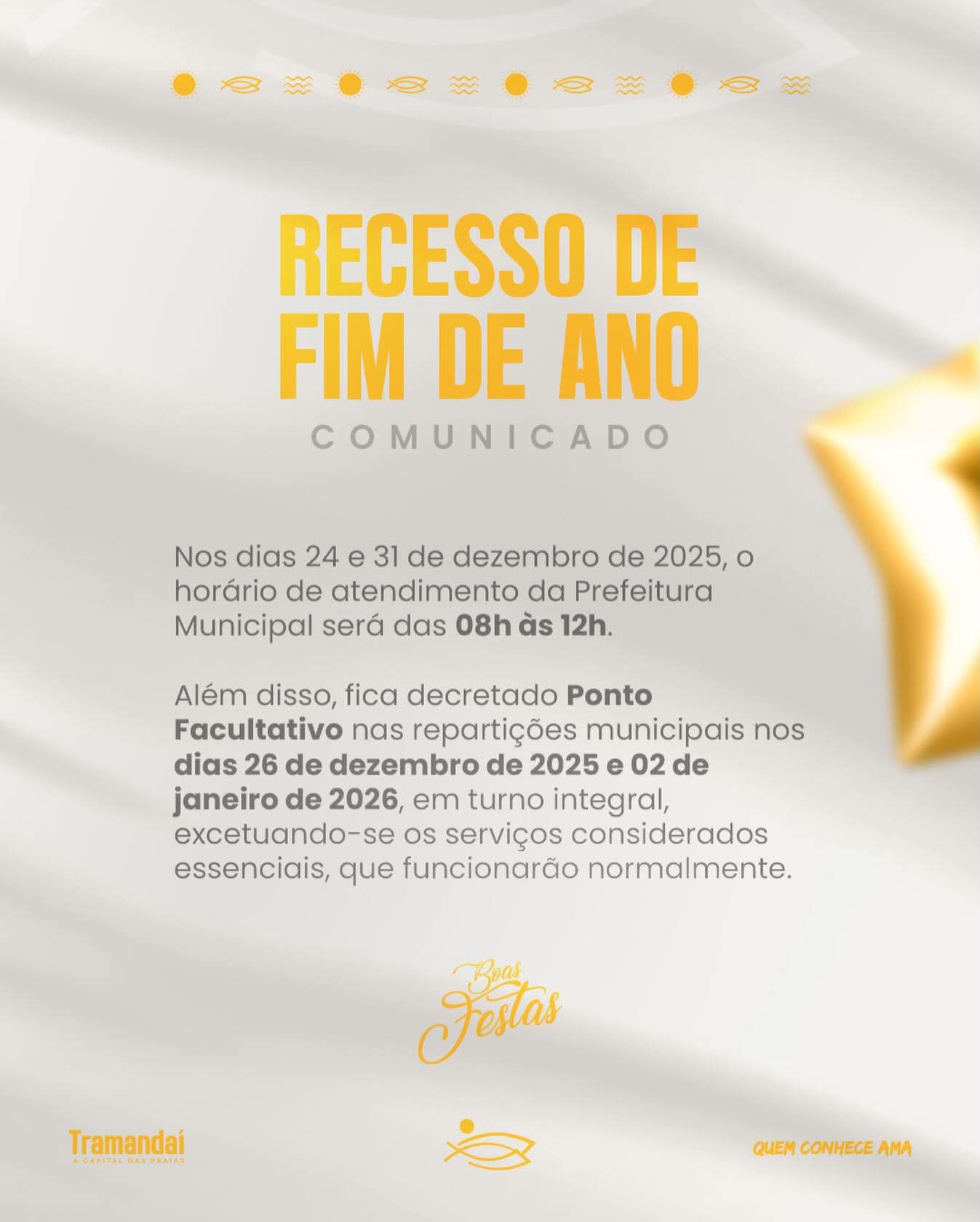 A Prefeitura de Tramandaí informa que foi publicado o Decreto nº 5.509/2025, que dispõe sobre alterações no horário de expediente e ponto facultativo em razão das festividades de final de ano.