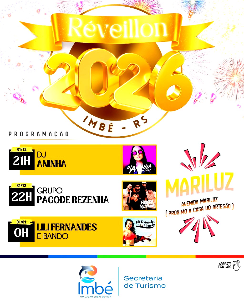 A virada de ano de 2025/2026 em Imbé será recheada de shows gratuitos espalhados em dois palcos montados no Centro e no balneário Mariluz. As apresentações iniciam ainda no dia 31 de dezembro, e seguem pela madrugada do dia 1º de janeiro.