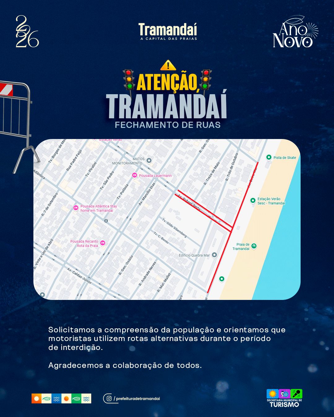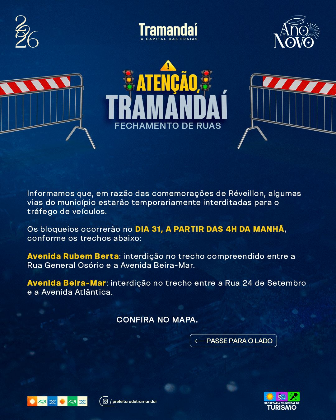 A Prefeitura de Tramandaí informa que, em razão das comemorações de Réveillon, algumas vias do município estarão temporariamente interditadas para o tráfego de veículos. A medida tem como objetivo garantir a segurança da população e a adequada organização do evento.
