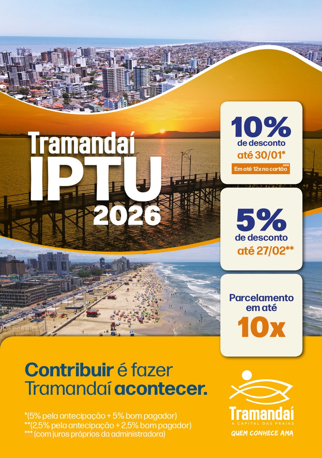 O secretário informou que em 2026 os contribuintes que optarem em pagar o tributo na cota única tem até 10% de desconto no pagamento com vencimento em 31 de janeiro, sendo 5% pela antecipação e 5% como bom pagador, isto é, aquele que está em dia com Tramandaí. Pagamento à vista na cota única até 28 de fevereiro tem até 5% de desconto, sendo 2,5% na antecipação e 2,5% para o bom pagador.