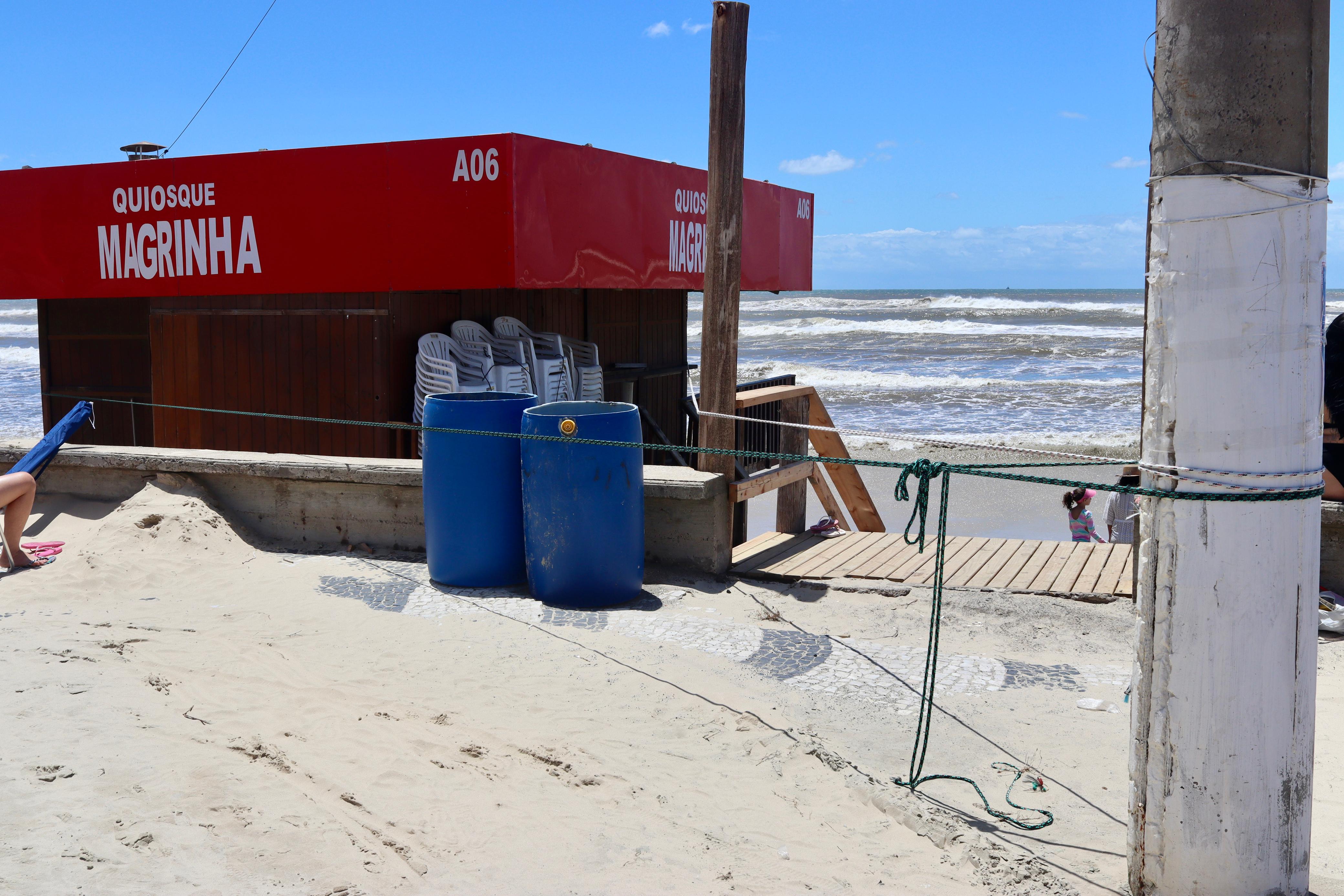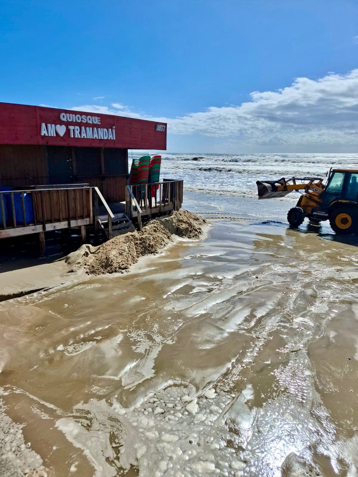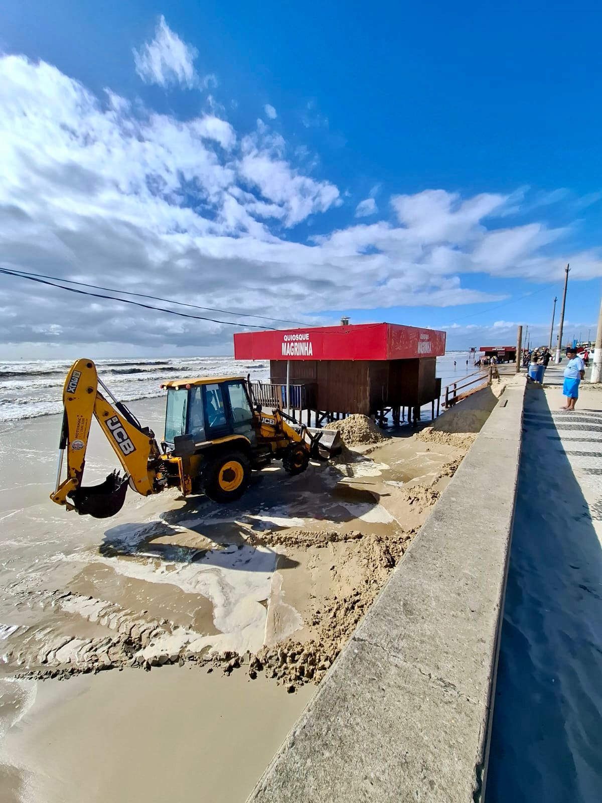 Ao todo, quatro quiosques demandaram atenção mais intensa. Durante todo o dia, as equipes permanecem no local realizando a reposição das contenções de areia, conforme o avanço do mar e a retirada do material pelas ondas.