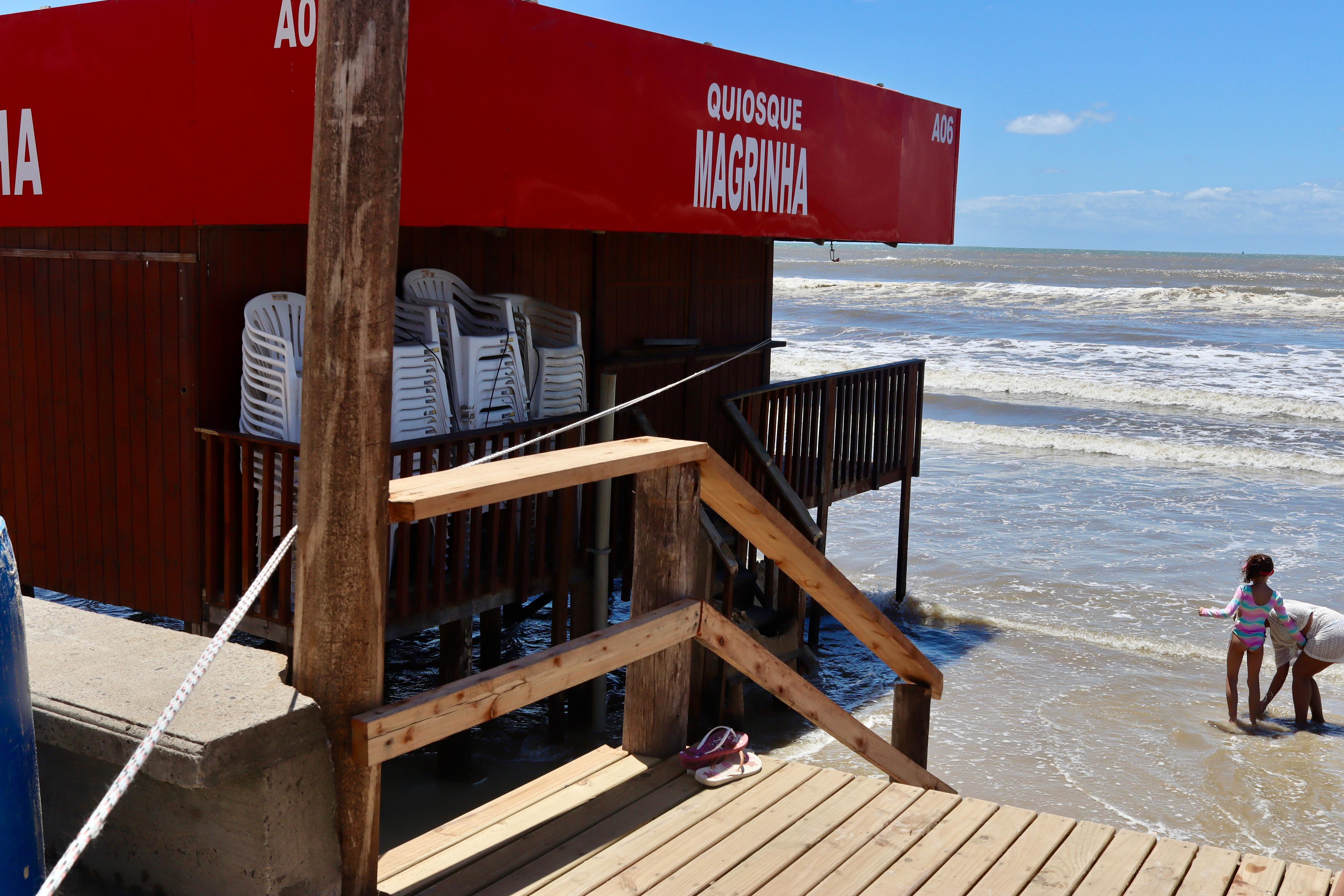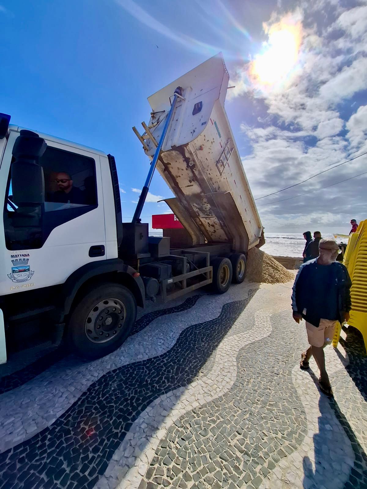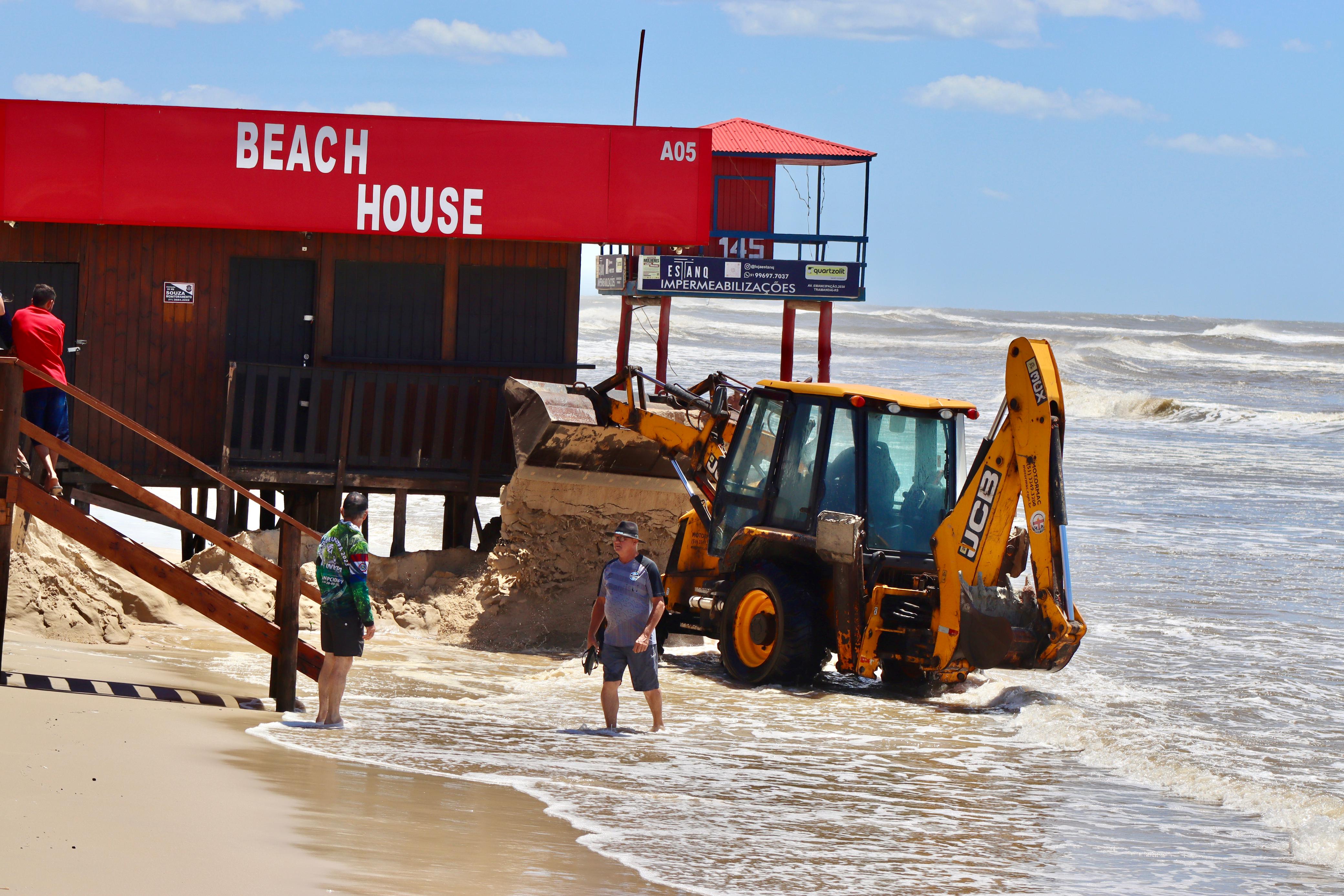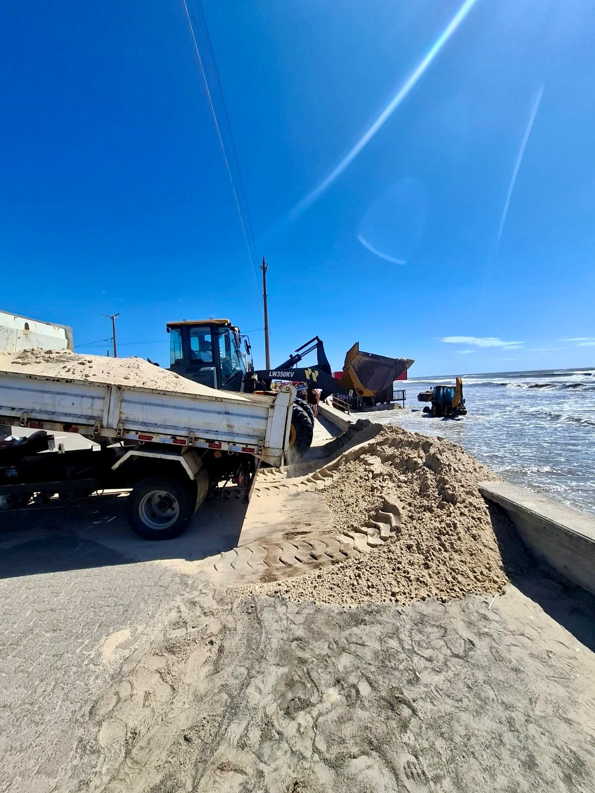Ao todo, quatro quiosques demandaram atenção mais intensa. Durante todo o dia, as equipes permanecem no local realizando a reposição das contenções de areia, conforme o avanço do mar e a retirada do material pelas ondas.