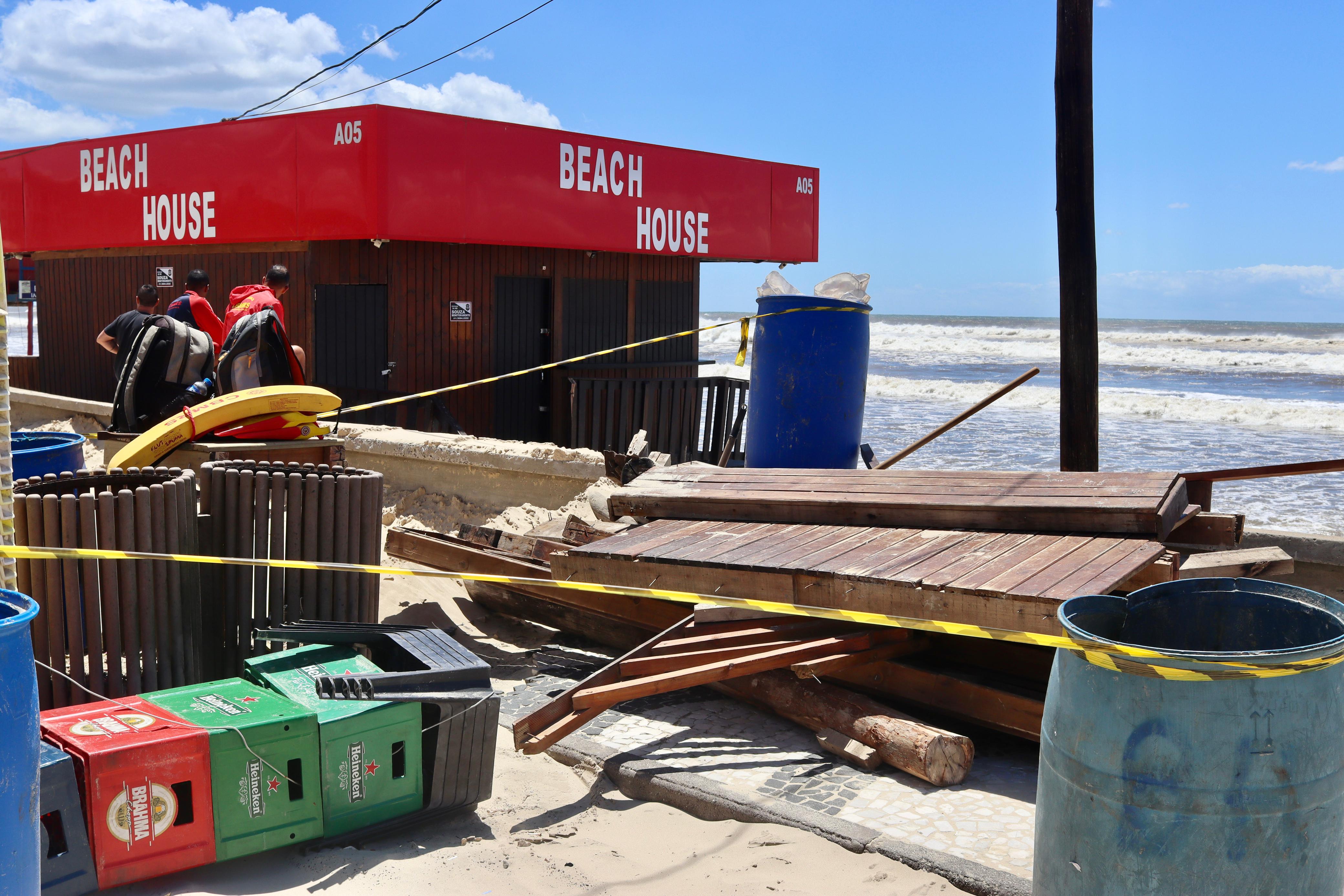 As equipes começaram os trabalhos por volta das 6h, com o objetivo de evitar que a ação contínua do mar causasse danos ainda maiores. Entre as medidas adotadas estão a realização de amarrações nas estruturas dos quiosques e a instalação de contenções de areia, criando uma barreira para reduzir o impacto das ondas.