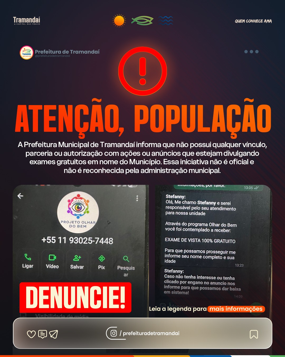 Essas divulgações não são oficiais e não são reconhecidas pela Administração Municipal. A Prefeitura reforça que não autoriza contatos por mensagens, ligações ou redes sociais oferecendo exames gratuitos em nome do poder público municipal.