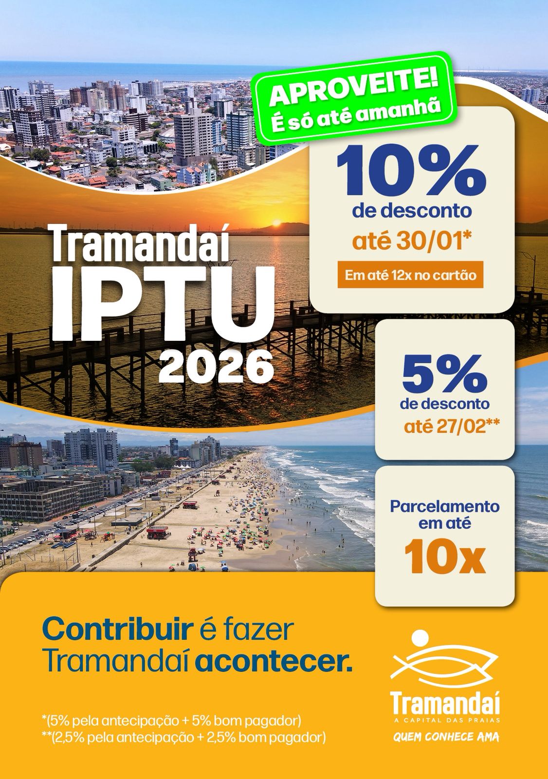 Os contribuintes de Tramandaí tem até esta sexta-feira, 30, para aproveitar o desconto de até 10% no pagamento do IPTU 2026 em cota única. O desconto de 10% é distribuído em 5% pela antecipação e 5% para o bom pagador, isto é, aquele que está em dia com Tramandaí.