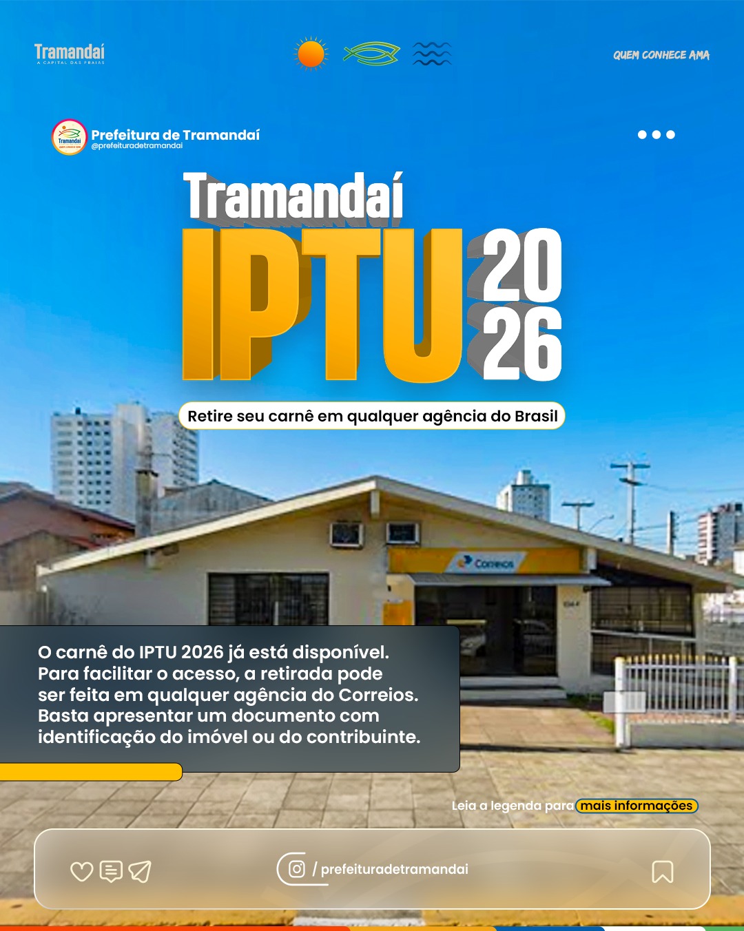 Os contribuintes de Tramandaí, principalmente aqueles que não residem na cidade, tem mais uma facilidade para acessar seu carnê do IPTU 2026. Uma parceria entre a Prefeitura de Tramandaí e os Correios permite que a estatal integre os canais de atendimento da prefeitura para a prestação de serviços de consulta de débitos do IPTU, assim como emissão de guia para pagamento e regularização do imposto.