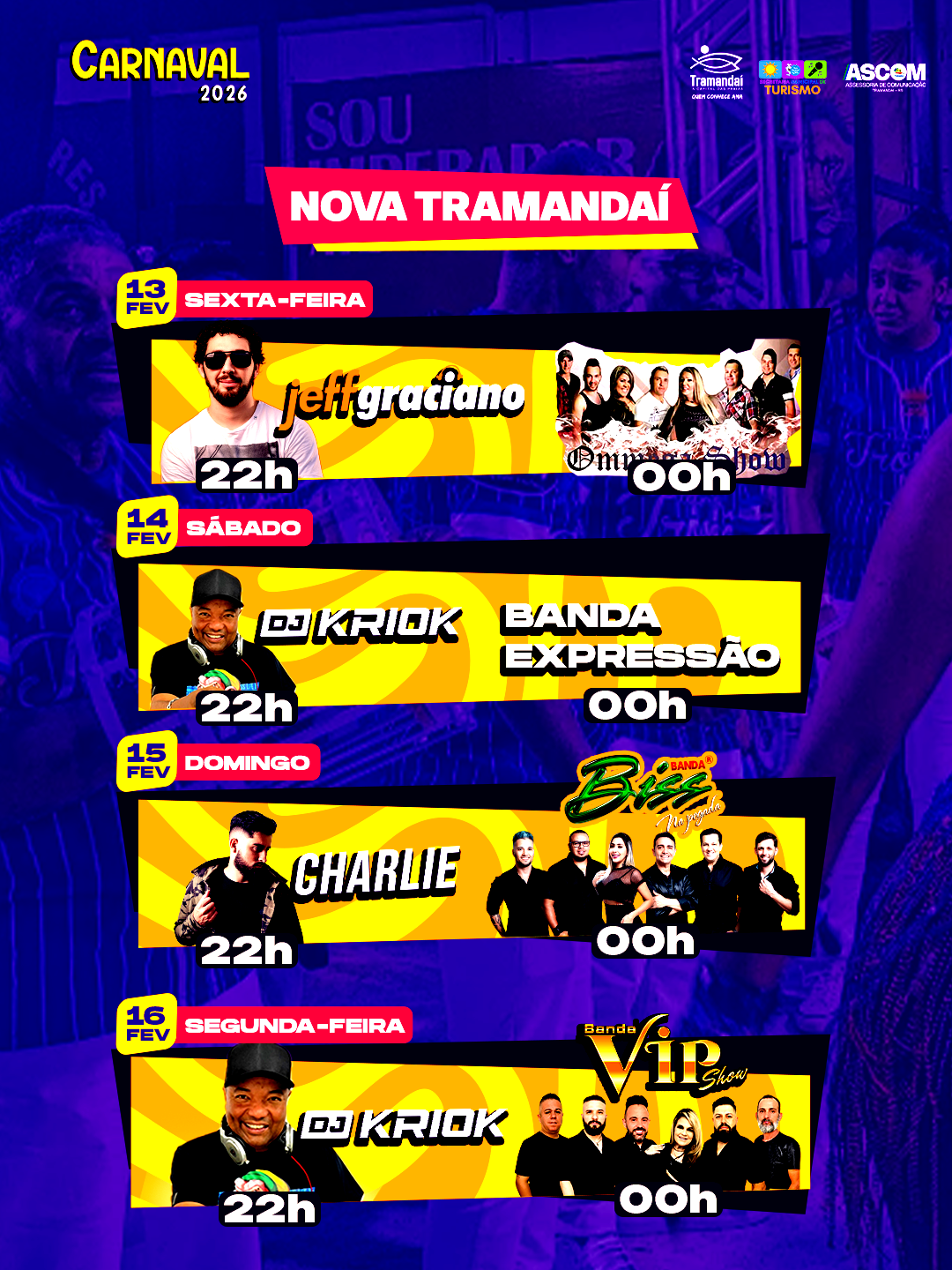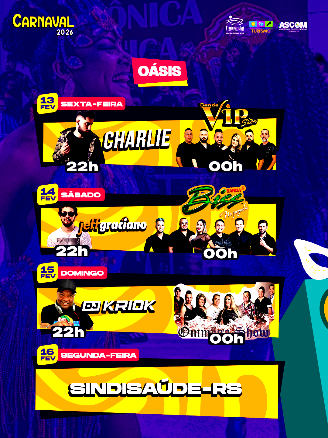 A Prefeitura de Tramandaí, por meio da Secretaria de Turismo, preparou uma programação especial para o Carnaval 2026, com quatro dias de muita música, samba, alegria e diversão, espalhados por diferentes pontos da cidade. É carnaval para todos os gostos!