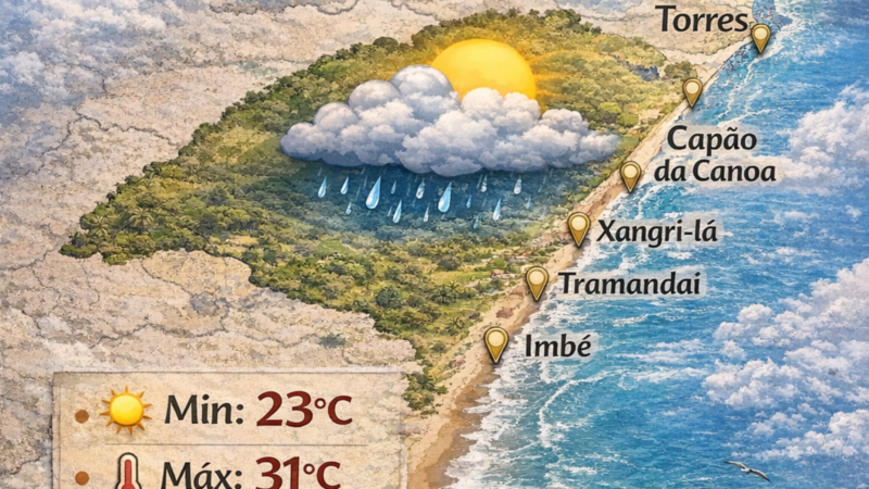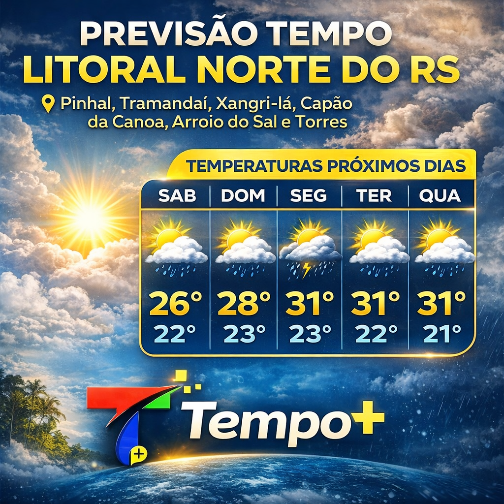 • Espera-se intervalo de máximas ~27–31 °C e mínimas ~20–23 °C, típicos do verão gaúcho na faixa litorânea com brisa marítima moderada.