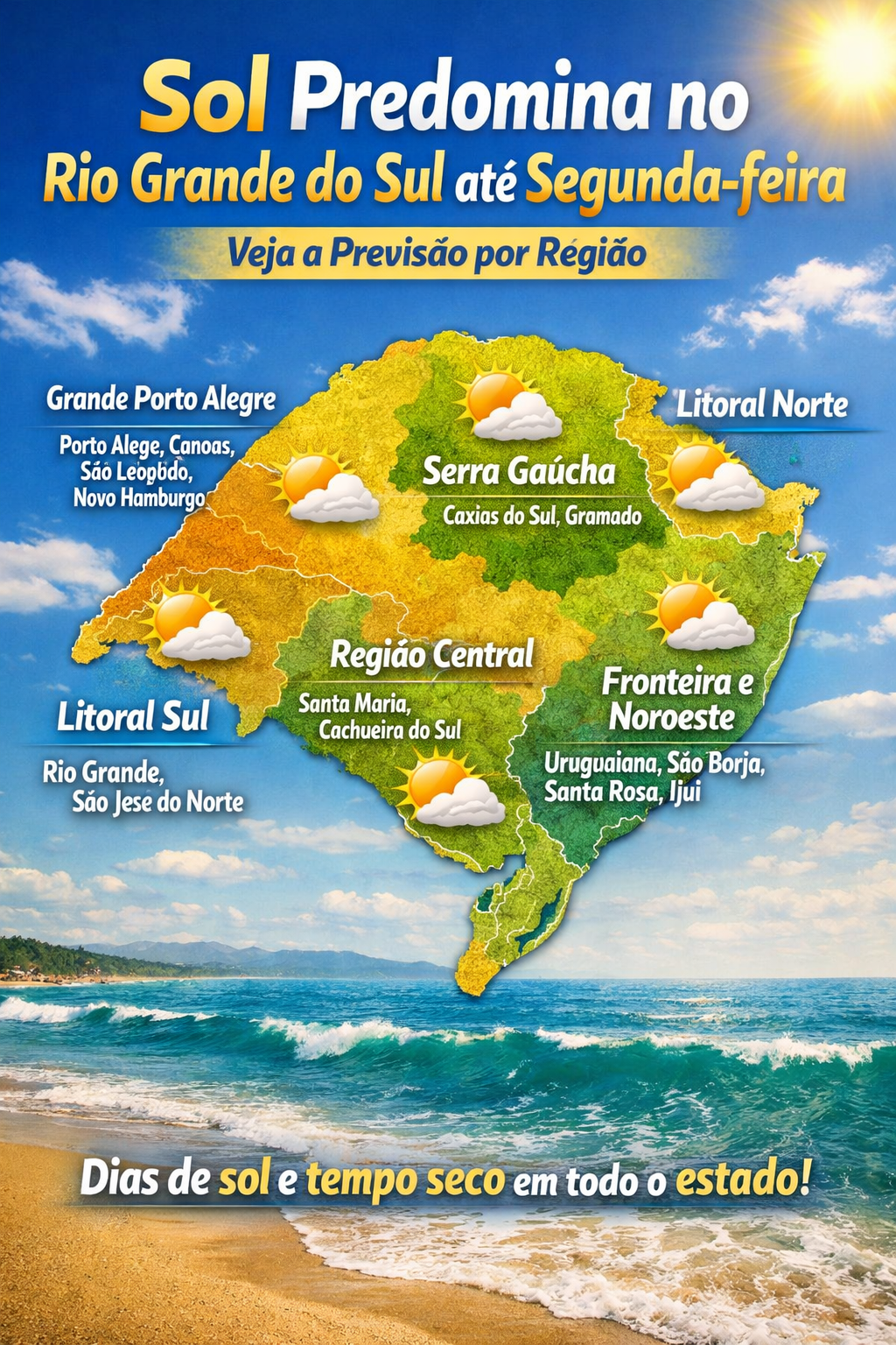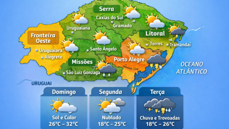 • Hoje e Sexta: Sol com algumas nuvens, sem chuva prevista. Porto Alegre deve ter máximas perto de 27–28 °C e mínimas de 17–18 °C.
