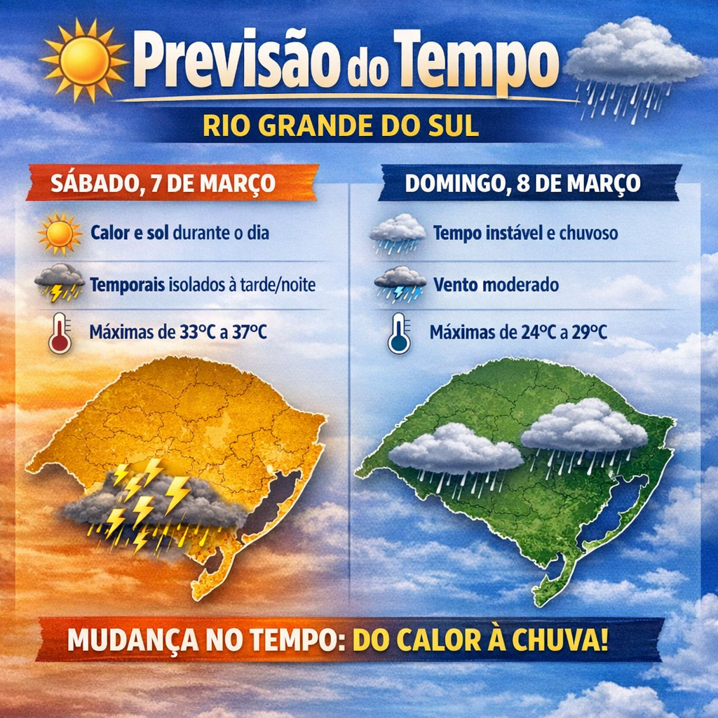 De acordo com projeções de institutos meteorológicos e modelos atmosféricos, o sábado (7) começa com predomínio de sol e temperaturas elevadas, que podem chegar perto dos 35°C a 37°C no interior. No entanto, ao longo da tarde e da noite, a aproximação de áreas de instabilidade pode provocar pancadas de chuva e temporais isolados, principalmente na Fronteira Oeste, Campanha e Região Central.