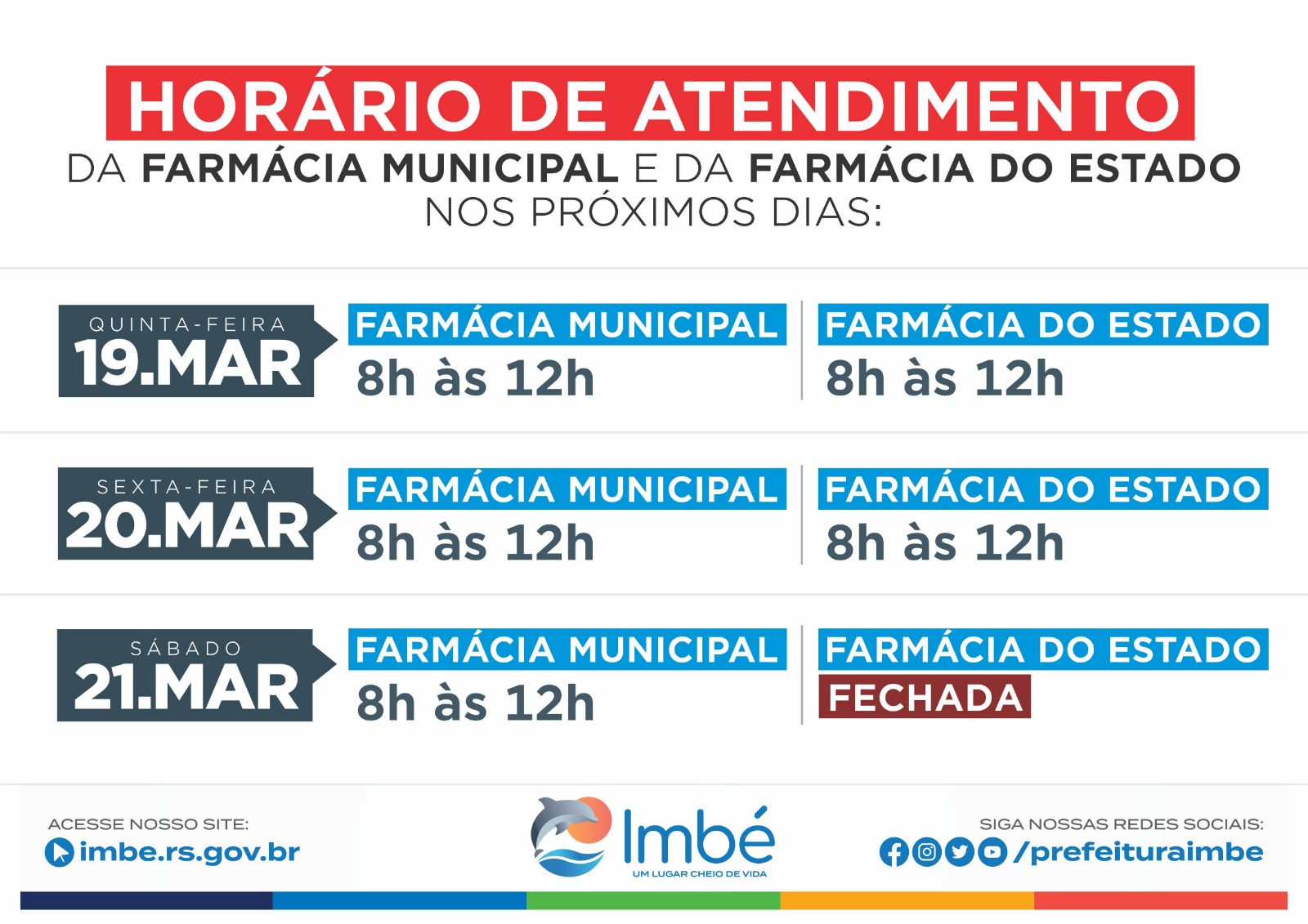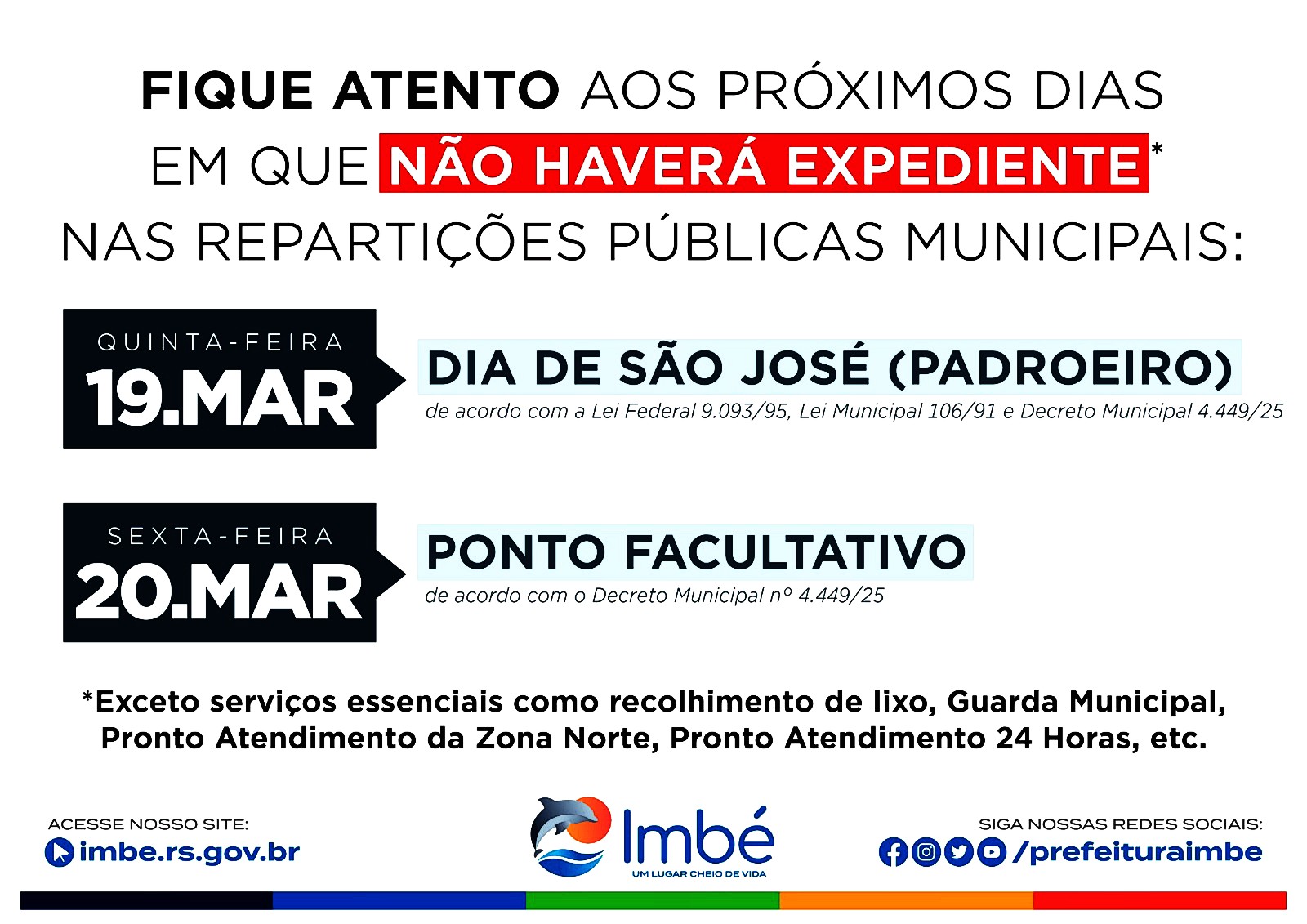 A Prefeitura de Imbé informa que não haverá expediente nas repartições públicas municipais nesta quinta (19) e também na sexta-feira (20), em razão do feriado de São José, padroeiro do município, e do ponto facultativo decretado para o dia seguinte.