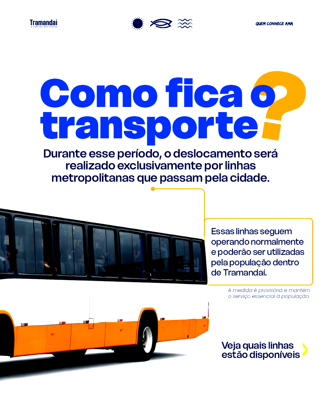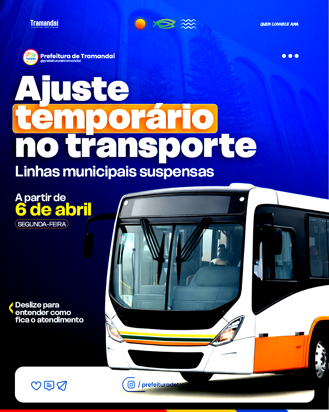 A Prefeitura de Tramandaí informa que, a partir desta segunda-feira, 6 de abril, as linhas do transporte público municipal estão temporariamente suspensas em razão de dificuldades no abastecimento de diesel, que afetam diretamente a operação da empresa responsável pelo serviço no município.