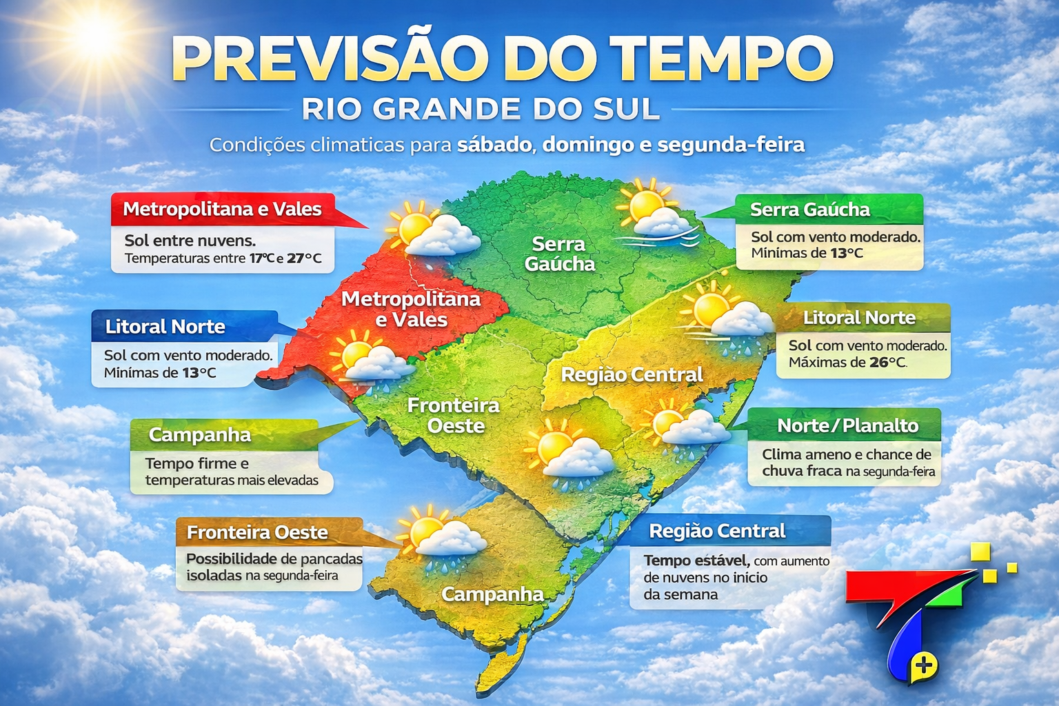 - Região Metropolitana e Vales – Porto Alegre, Canoas, Gravataí e Novo Hamburgo terão sol entre nuvens, com temperaturas entre 17°C e 26°C.