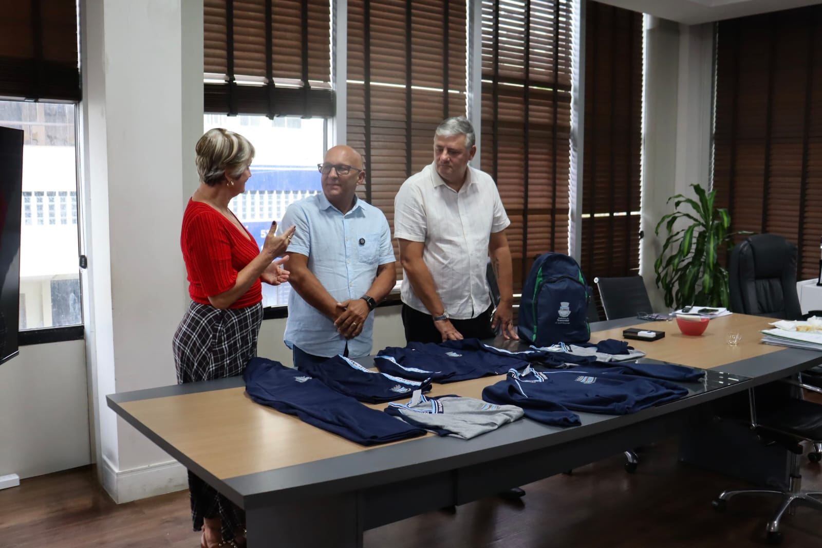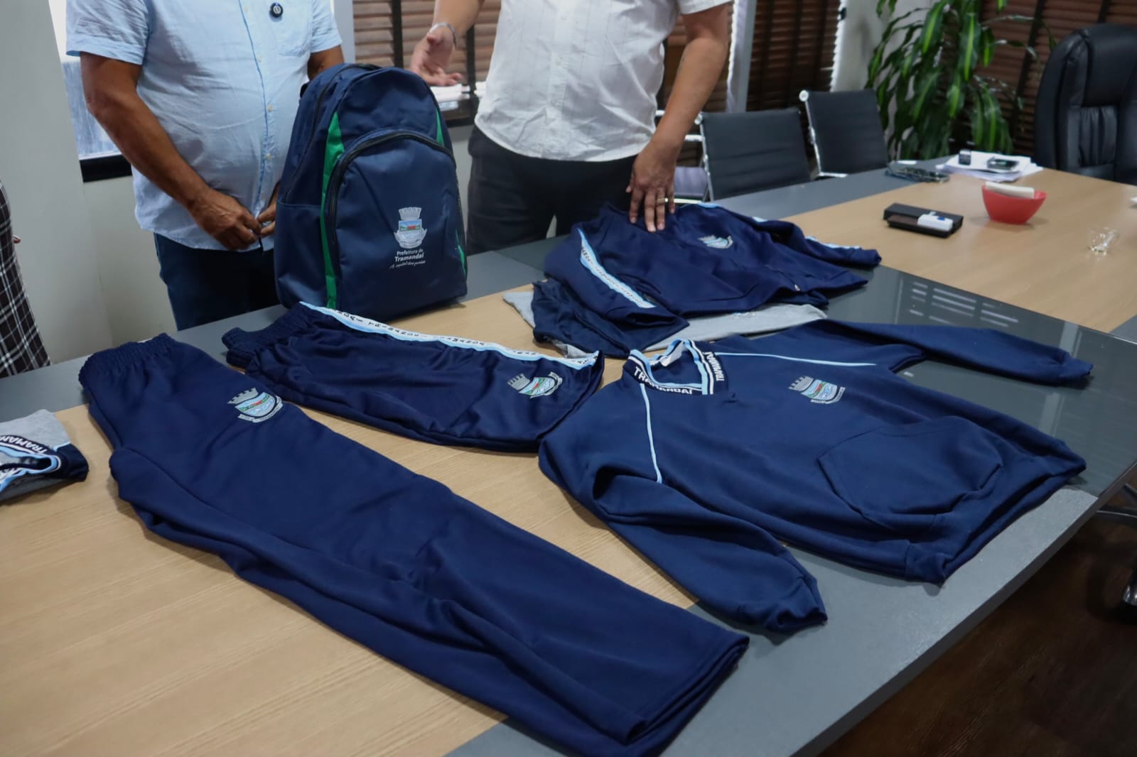 Na tarde desta quinta-feira (23/04), no Gabinete do Prefeito, o prefeito Juarezinho, o vice-prefeito Claudiomir e a secretária de Educação, Alvanira Ferri Gamba, anunciaram a chegada de uma nova remessa de uniformes escolares destinados aos alunos da rede municipal de ensino.