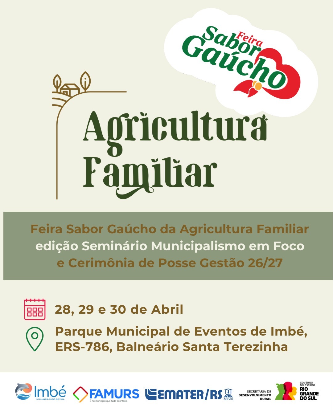 O Parque Municipal de Eventos recebe, nos dias 28, 29 e 30 de abril, a Feira Sabor Gaúcho da Agricultura Familiar, que integra o Seminário Municipalismo em Foco, da Federação das Associações de Municípios do Rio Grande do Sul (FAMURS).