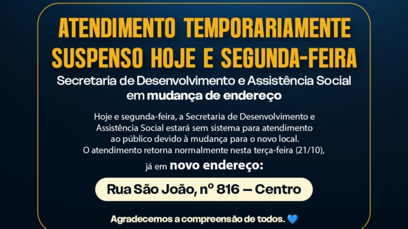 Secretaria de Desenvolvimento e Assistência Social muda de endereço e retoma atendimento na próxima terça-feira (21/10)