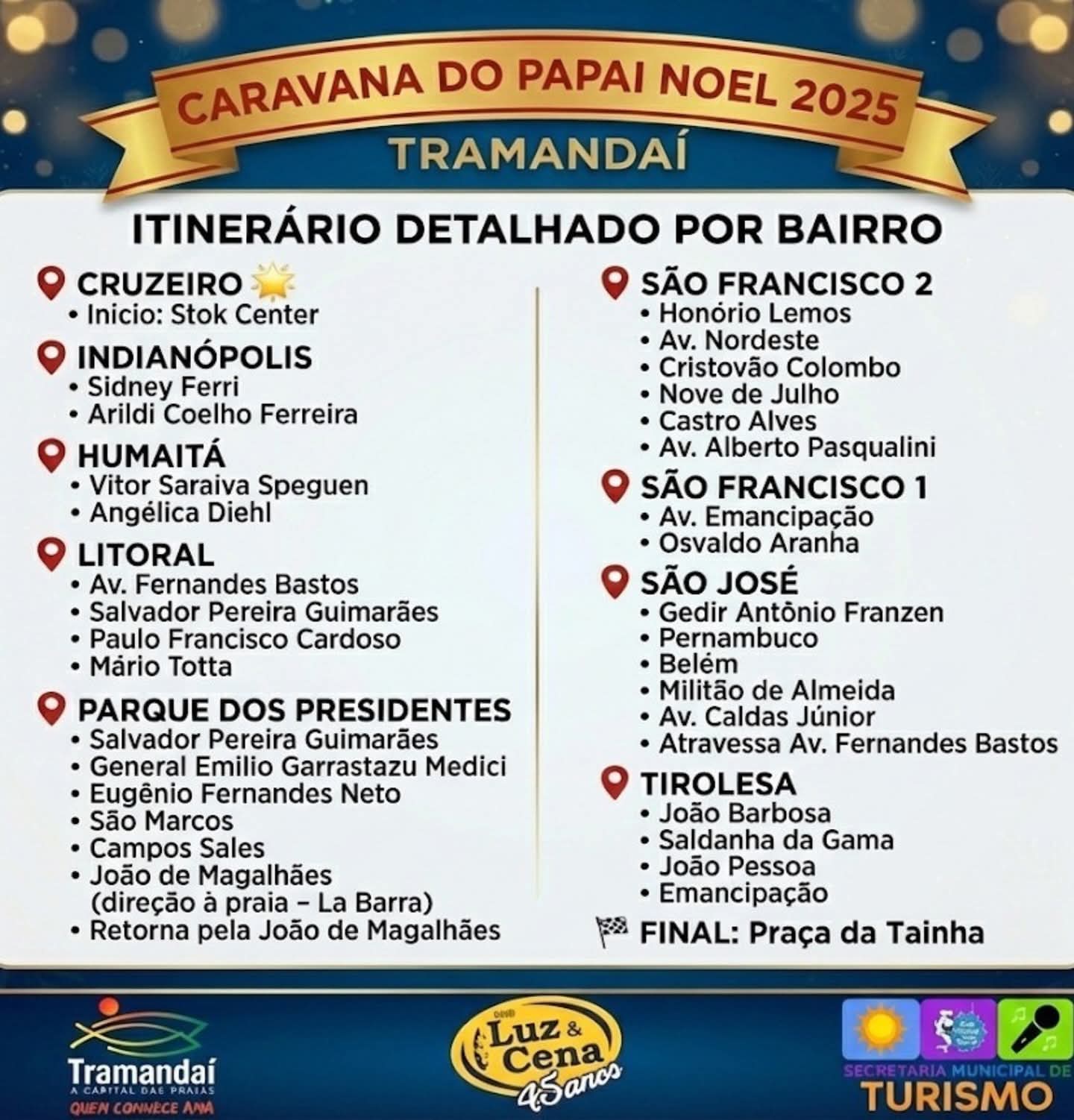 A Caravana do Papai Noel é uma realização do Luz e Cena, com apoio da Prefeitura de Tramandaí, por meio da Secretaria Municipal de Turismo.