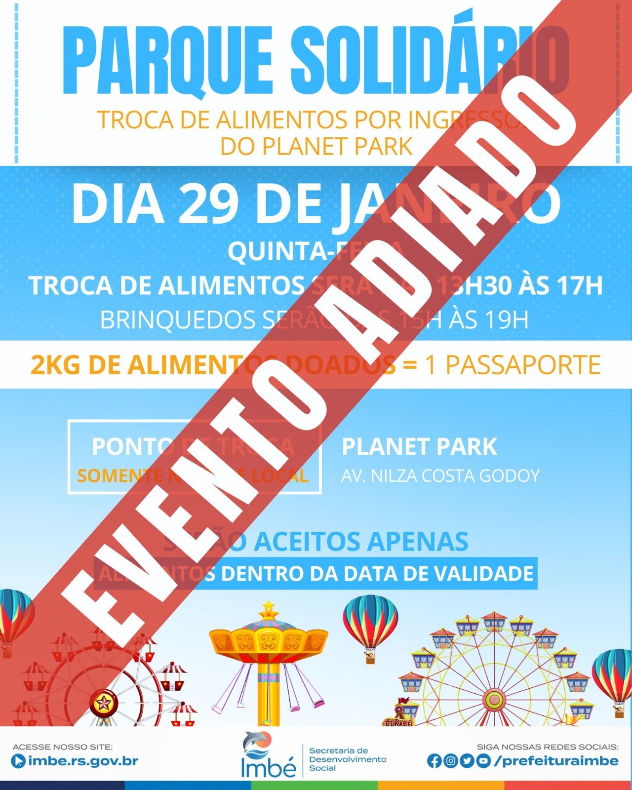 Em decorrência do mau tempo a edição de 2026 do Parque Solidário foi adiada, e ocorrerá na próxima quinta-feira (05 de fevereiro), das 15h às 19h.