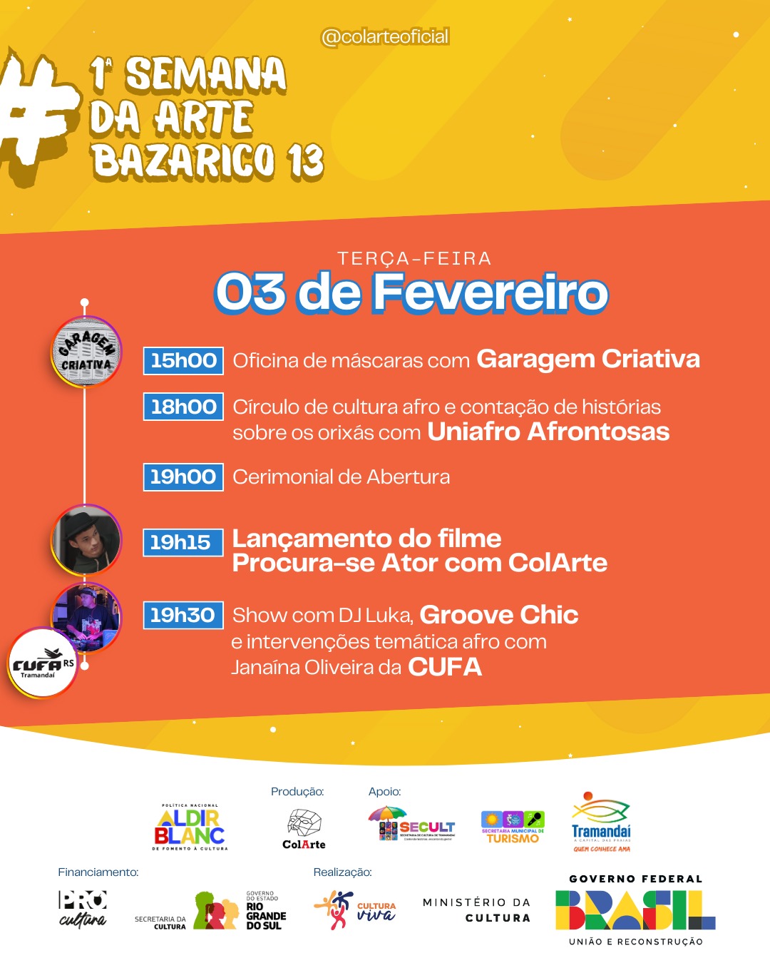 A abertura oficial, no dia 03 de fevereiro, conta com oficinas, atividades voltadas à cultura afro-brasileira, cerimônia de abertura, lançamento do filme “Procura-se Ator” e apresentações musicais. Ao longo dos dias seguintes, a programação se desdobra com oficinas de escrita, artes visuais, máscaras, pintura, grafite e dança, além de saraus, rodas de samba, discotecagens em vinil, teatro, cinema e encontros musicais.