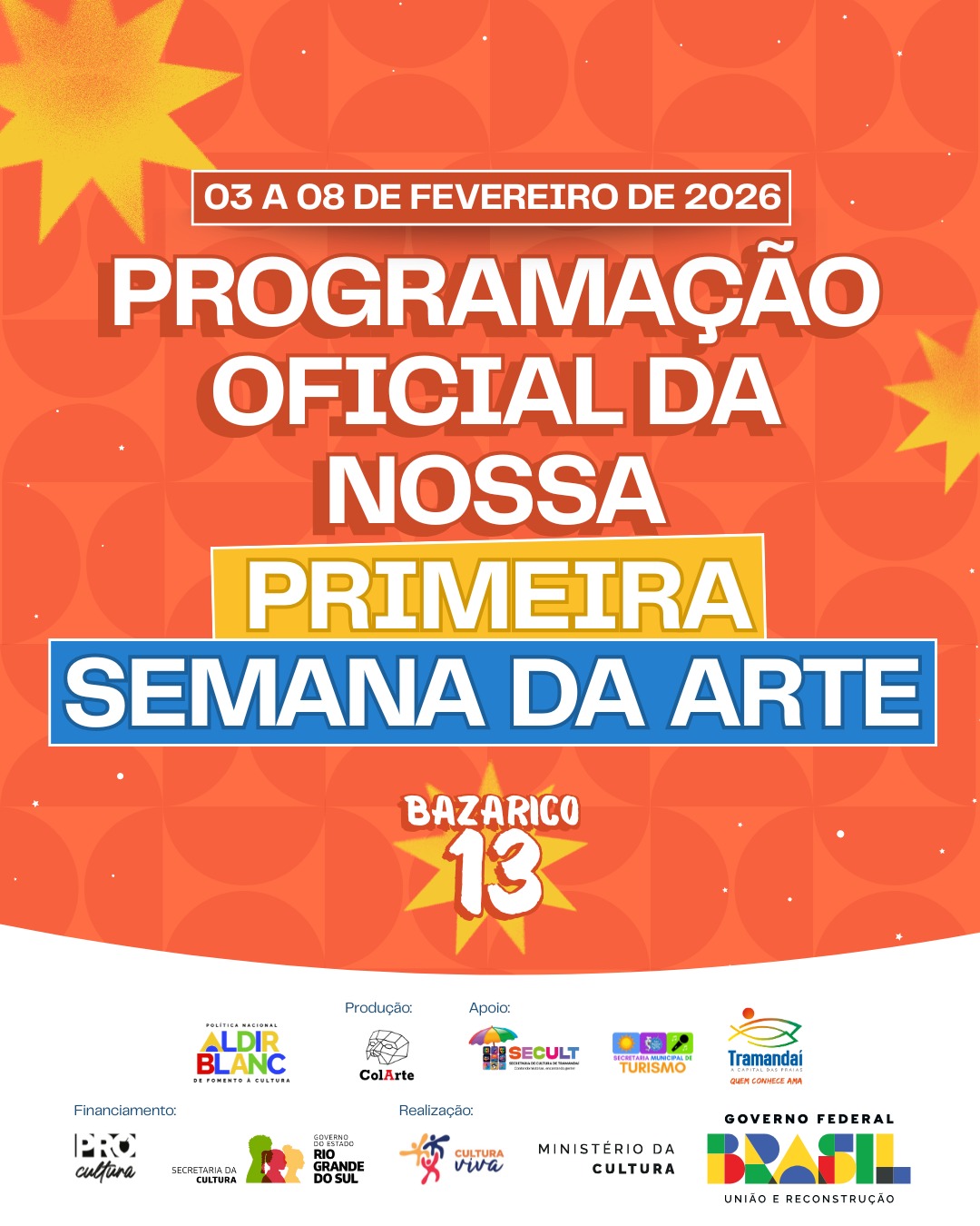 Entre os dias 03 e 08 de fevereiro, Tramandaí será palco da 1ª Semana da Arte – Bazarico 13, uma grande celebração da produção cultural local que acontece na Casa ColArte, reunindo exposições, oficinas, cinema, música, teatro, dança, literatura e uma feira multicultural e gastronômica. A iniciativa marca um momento histórico para a cultura da cidade, consolidando o trabalho em rede entre coletivos, artistas e entidades culturais do município.