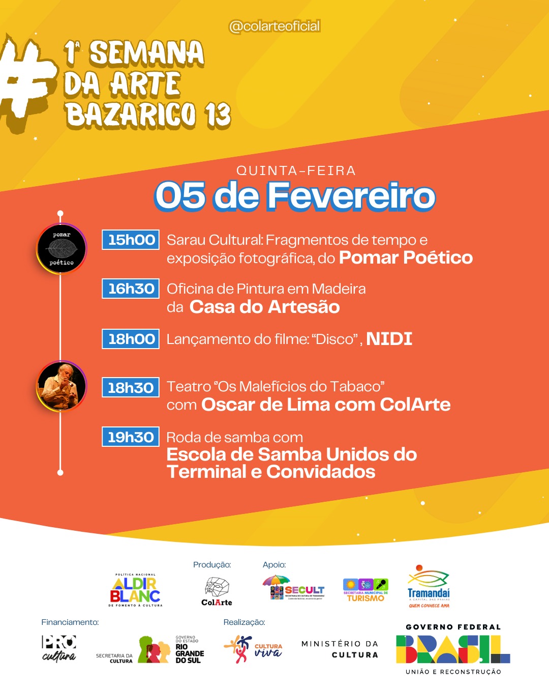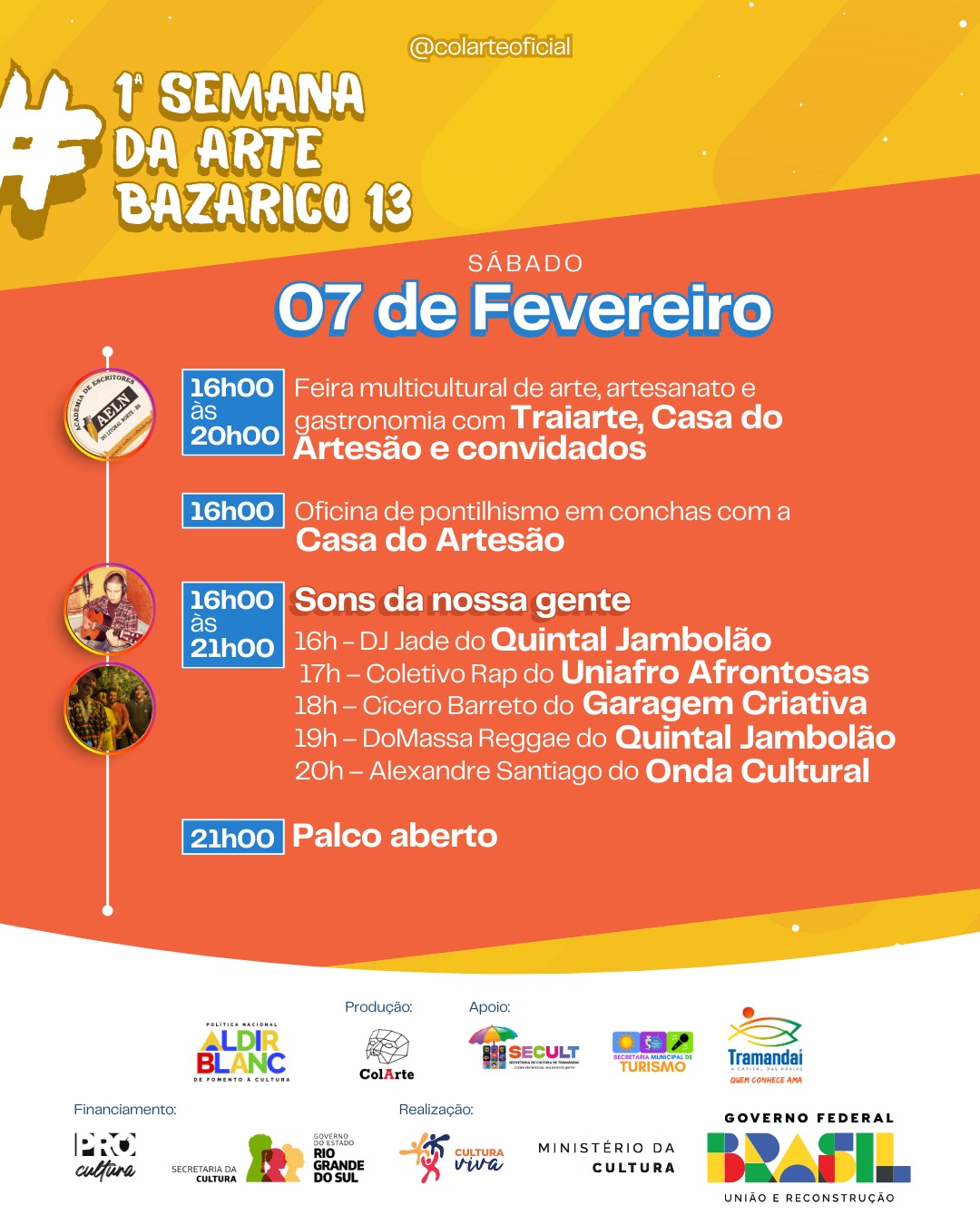A programação é gratuita e aberta à comunidade. A Casa ColArte convida o público a participar, prestigiar os artistas locais e vivenciar uma semana inteira dedicada à arte, à diversidade e à cultura viva.