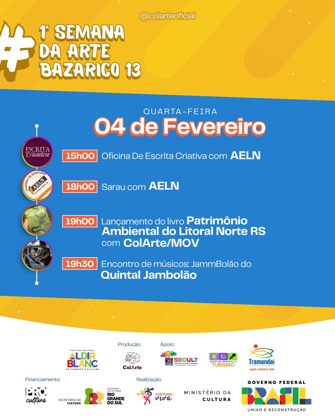 A Semana da Arte integra o projeto “Fortalecendo Nossa Cultura”, desenvolvido pelo ColArte – Ponto de Cultura e Coletivo de Artistas Independentes, com o objetivo de qualificar, articular e fortalecer os coletivos culturais de Tramandaí, estimulando a organização, a troca de saberes e a construção coletiva de políticas culturais no território.