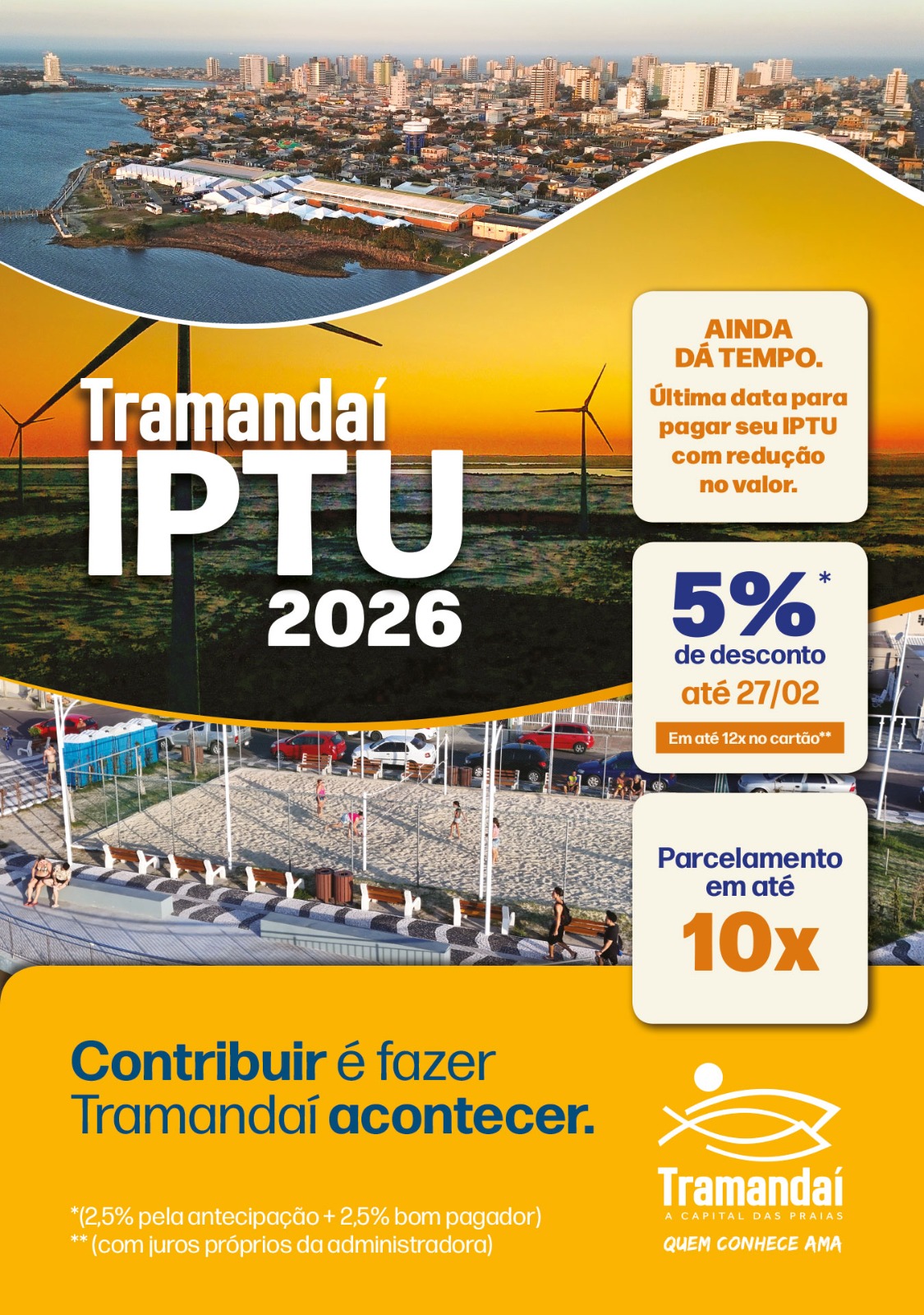 O contribuinte de Tramandaí que ainda não pagou seu IPTU 2026, pode fazê-lo em fevereiro pagando em cota única com até 5% de descontos, distribuídos em 2,5% por antecipação e 2,5% para o bom pagador, isto é, aquele contribuinte que não dívidas com o município.