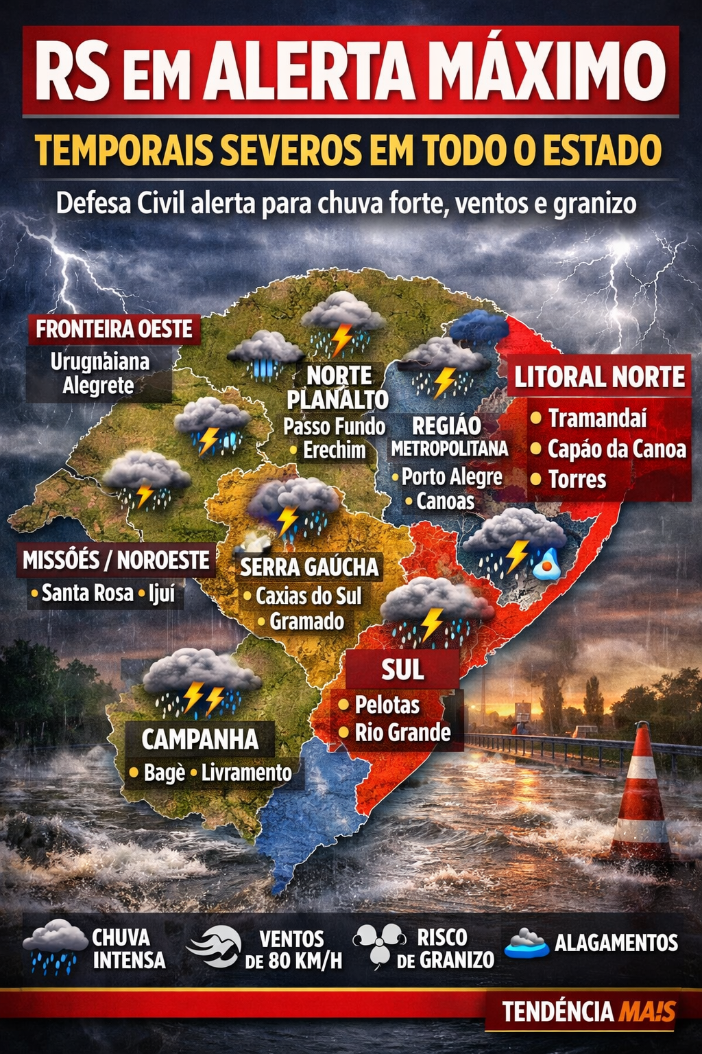O Litoral Norte concentra atenção especial das autoridades. Cidades como Tramandaí, Capão da Canoa, Torres e Imbé devem registrar mudança rápida nas condições do tempo, com previsão de chuva forte e ventos intensos principalmente entre a tarde e a noite.