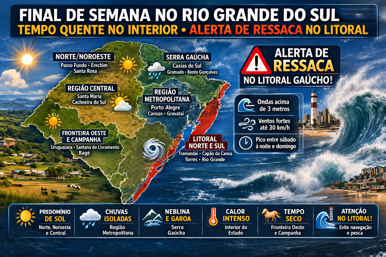 O final de semana no Rio Grande do Sul será marcado por condições climáticas distintas entre o litoral e o interior do Estado. Enquanto a maior parte das regiões terá tempo firme e temperaturas elevadas, o litoral gaúcho deve enfrentar mar agitado e risco de ressaca, exigindo atenção redobrada de moradores, pescadores e navegantes.