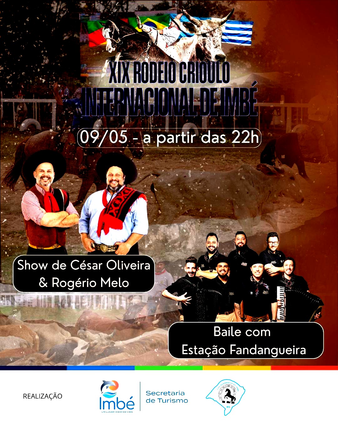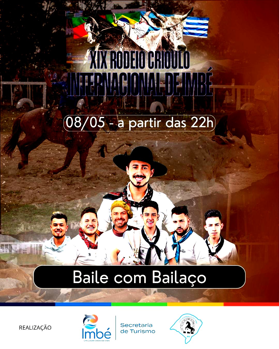 As noites do XIX Rodeio Crioulo Internacional de Imbé serão recheadas de muita música e dança com os shows e bailes, com início às 22h, que prometem agitar os amantes do tradicionalismo. O rodeio acontece entre os dias 6 e 10 de maio, no Parque Municipal de Eventos.