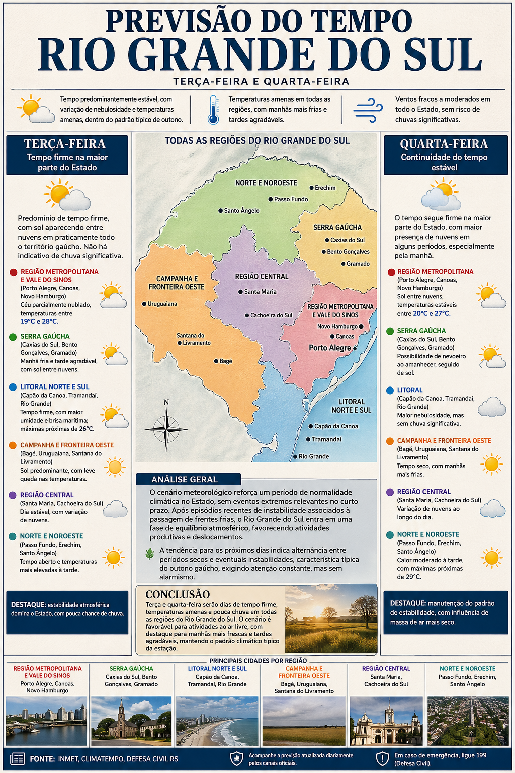 - Norte e Noroeste (Passo Fundo, Erechim, Santo Ângelo): tempo aberto e temperaturas mais elevadas à tarde.